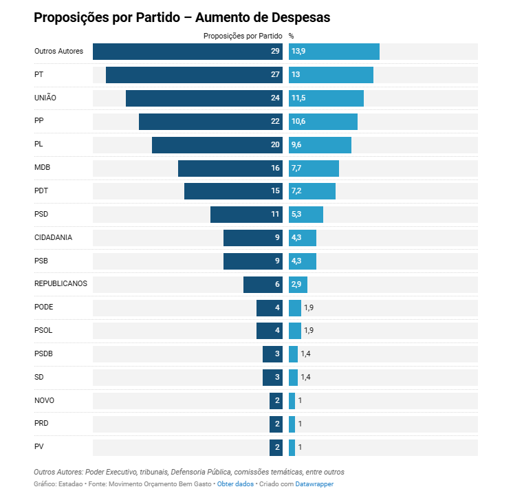 Considerando apenas os projetos que aumentam despesas, o Executivo e outros autores como tribunais de Justiça, Defensoria Pública e comissões temáticas do Congresso são os campeões de propostas, respondendo por 13,9% do total analisado pelo estudo. Entre partidos com parlamentares autores de projetos que elevam os gastos públicos, o PT lidera, com 13%, seguido por União Brasil (11,5%), PP (10,6%) e PL (9,6)%.
