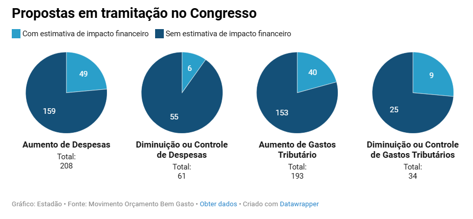 Foram contabilizadas 496 propostas que implicam em aumento de despesas, diminuição de gastos, aumento de benefícios tributários, redução ou controle de renúncias fiscais. Apenas 104 projetos, que representam 21% do total, possuíam estimativa de impacto financeiro no momento em que foram apresentados.