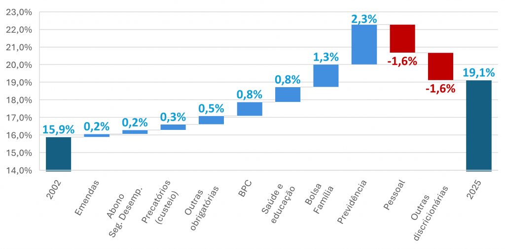 Na figura acima, a primeira coluna representa o gasto primário de 15,9% do PIB em 2002. A última coluna, o gasto primário de 19,1% do PIB que, segundo nossas estimativas, será executado em 2025. Ou seja, nos últimos 23 anos o gasto público primário cresceu 3,2 pontos percentuais (pp) do PIB.