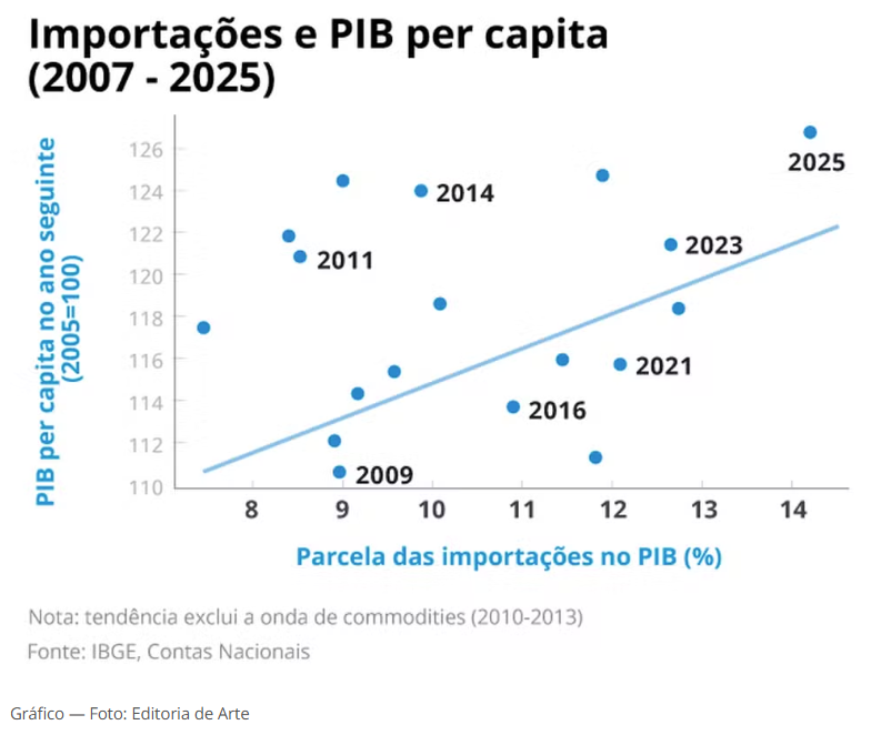 Os dados ajudam a esclarecer a questão. O gráfico abaixo relaciona a parcela das importações no PIB em um ano com o PIB per capita do ano seguinte, desde meados dos anos 2000. A mensagem é sugestiva: anos em que o país importa relativamente mais tendem a ser seguidos por níveis mais altos de renda. Outras variáveis, como a onda de commodities entre 2010 e 2013, intervêm, mas o padrão é recorrente, não episódio isolado.