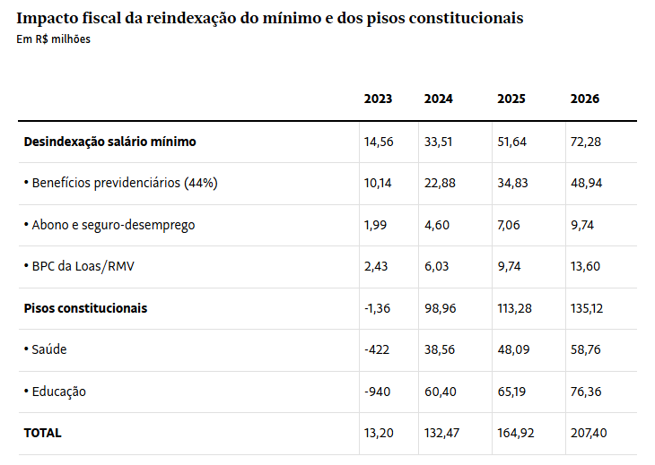 A tabela abaixo apresenta o impacto nas contas públicas, no terceiro mandato do presidente Lula, da retomada da política de elevação do valor real do salário mínimo (SM) e da reindexação à Receita Corrente Líquida (RCL) dos gastos mínimos que a Constituição estabelece que a União tem de despender com saúde e educação.